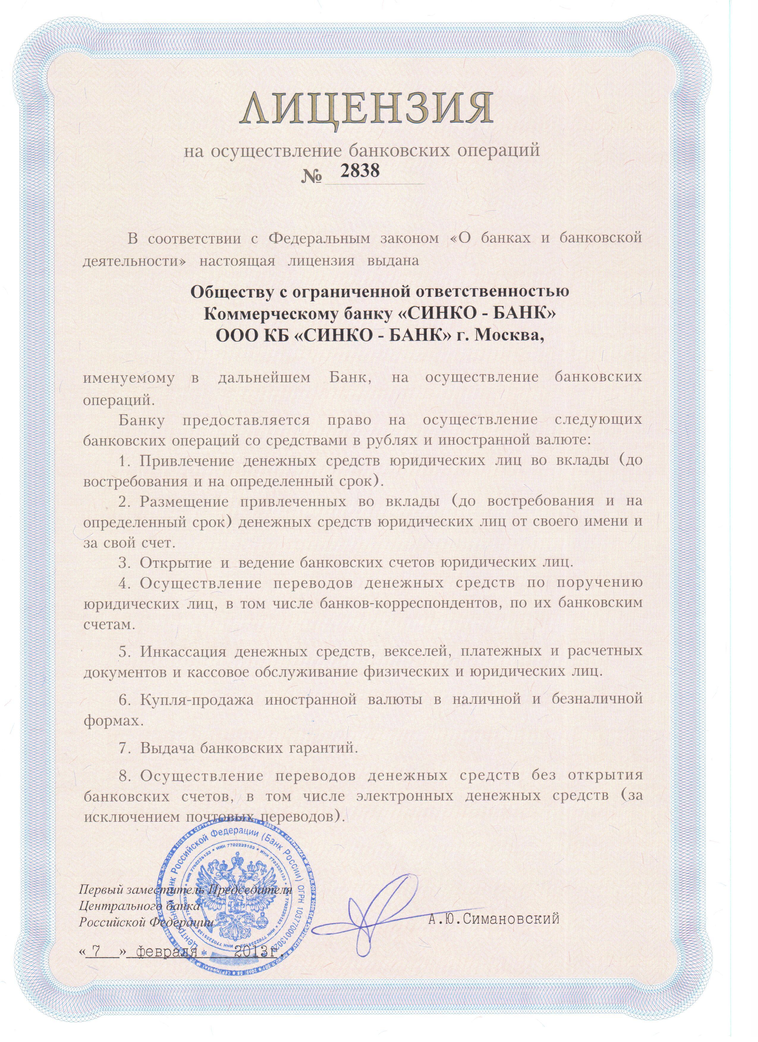 ООО КБ «СИНКО-БАНК» имеет право на осуществление следующих банковских операций: